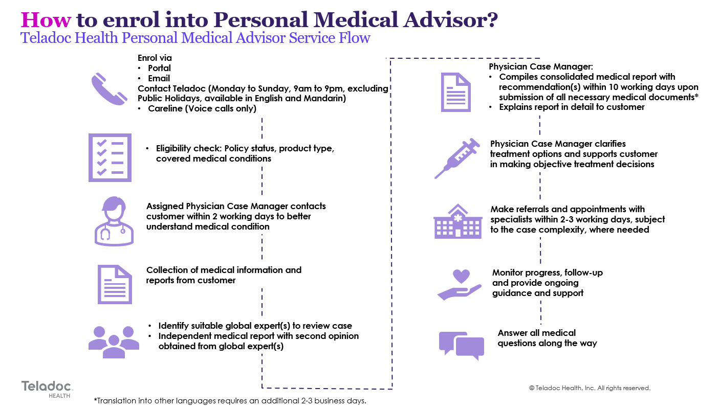 Teladoc Health, Inc is the service provider for Personal Medical Advisor Service. Teladoc Health is a global virtual care leader in telehealth services with over 25 years in business serving millions of customers in Asia and around the world.
